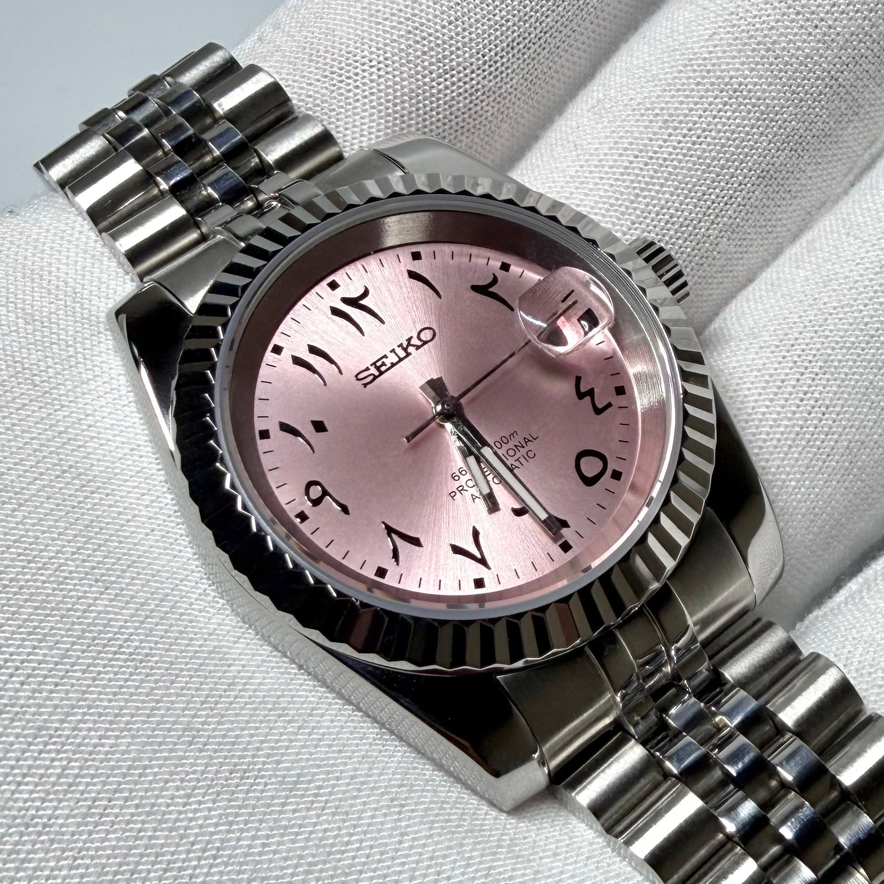 La Seiko mod Arabic dial rose combine style et fiabilité. Son mouvement automatique apporte une précision constante et une réserve de marche d’environ 41 heures. Le cadran rose donne une touche moderne et légère.