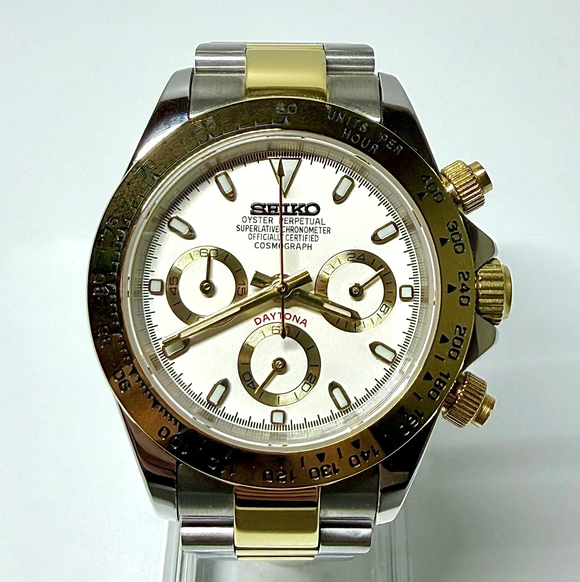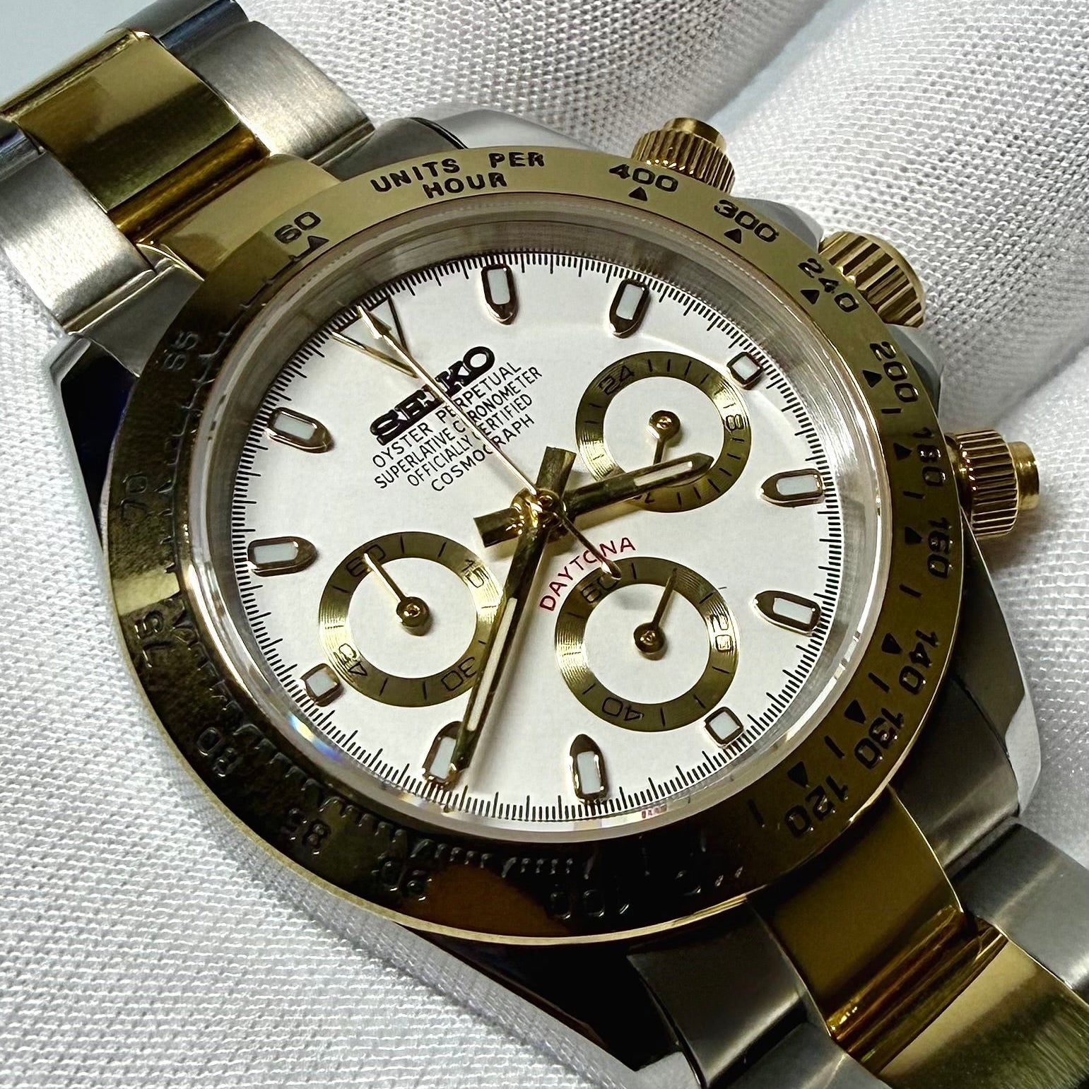 La Seiko mod Daytona Or allie élégance et dynamisme. Son design inspiré du célèbre chronographe impose style et présence au poignet. Son mouvement quartz assure une précision fiable et constante, sans nécessité de remontage.